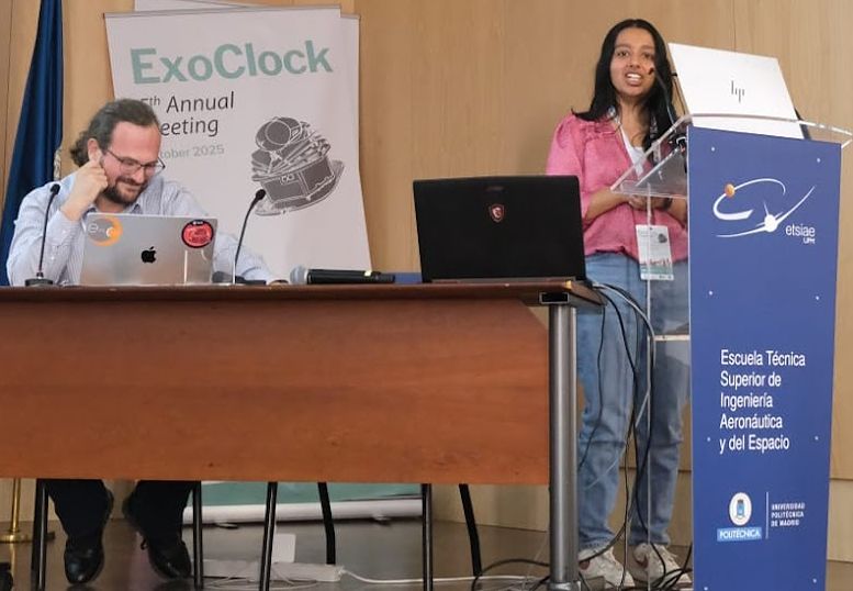 On October 4, 2025, I gave an oral presentation of my year-long research, "Extending Exoplanet Ephemerides through TTV Analysis with NEPTUNE and Ground-Based Observations," at the 5th ExoClock Annual Meeting held at the Polytechnic University of Madrid, Spain. I shared how I performed 100,000+ computer simulations of Transit Timing Variations (TTVs) and combined them with ground based photometry data to extend the orbital ephemerides of exoplanets. The meeting was attended by 100+ scientists and astronomers working on refining exoplanet ephemerides in preparation for the ESA Ariel telescope. Read More