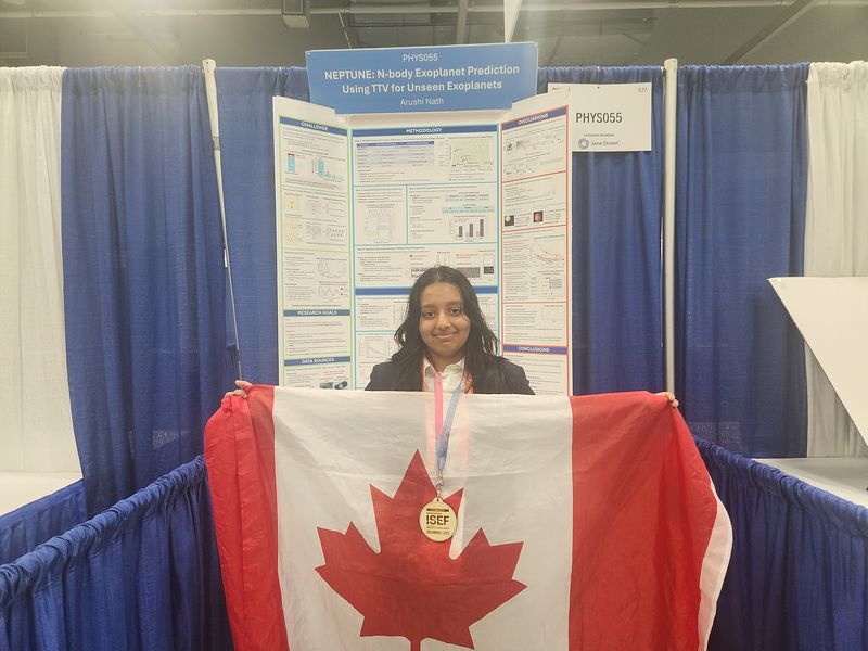 I represented Canada at the 2025 Regeneron International Science and Engineering Fair (ISEF). My project, "NEPTUNE: N-body Exoplanet Prediction Using TTV for Unseen Exoplanets," won the Third Grand Prize in the Physics and Astronomy category. My research combines N-body simulations and Transit Timing Variations (TTVs) to detect unseen exoplanets, improving orbital ephemerides and aiding in the discovery of new planetary companions. This work was validated with Kepler-46b data and continues to expand with contributions to NASA’s TESS and ESA’s ExoClock initiatives. Read more