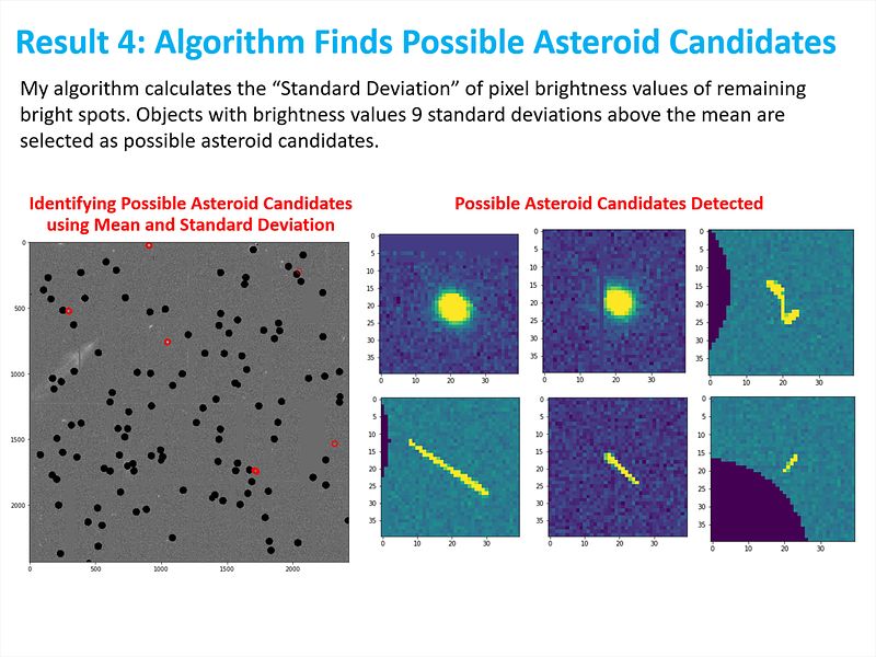 - After filtering out noise by applying standard deviation, the remaining unmasked objects in the image were possible asteroid candidates.