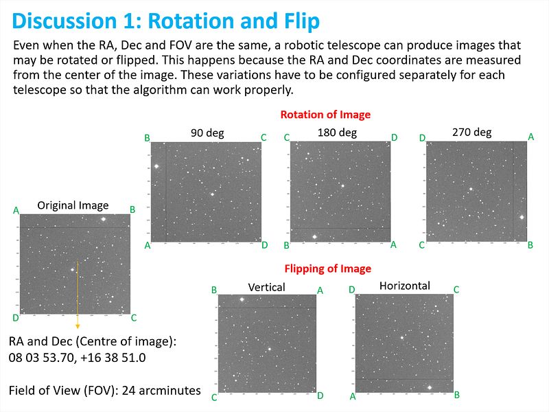 While the algorithm extracted the Right Ascension, Declination, and Field of View from the FITS file, it did not provide the rotation angle of the images or if they were flipped. As images rotated by different degrees or flipped around, the horizontal and vertical axis would have the same values, the algorithm must be configured on these variations for each telescope.