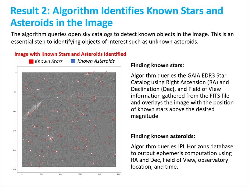 Earlier, my algorithm queried the USNO B-1 Star Catalog to detect known stars in the scaled images. But it was only able to identify and mask around 90% of known stars, as it is currently outdated. I switched to the GAIA EDR3 Catalog, which contained up to 20.7 magnitude stars observed between 2014 and 2017. It led to almost 100% detection of known stars and decreased false positive asteroid candidates.