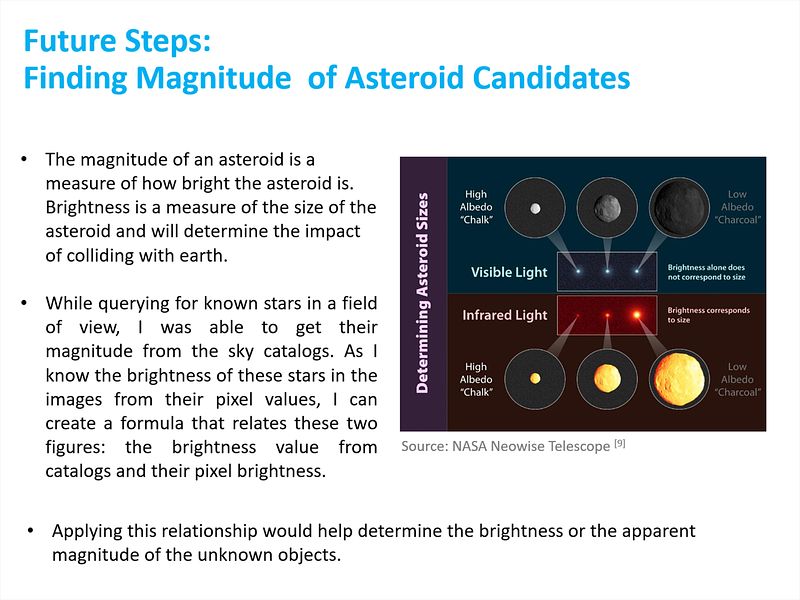 I plan to extend my algorithm to be able to analyze multiple images. It will provide more information about asteroid candidates, such as if they are moving and if the movement is in a straight line. It will improve the asteroid detection rate and provide information about their orbits and their magnitude based on pixel brightness. As brightness is linked to the size of the asteroid, I will be able to determine what would be the impact of a possible collision.