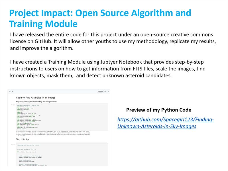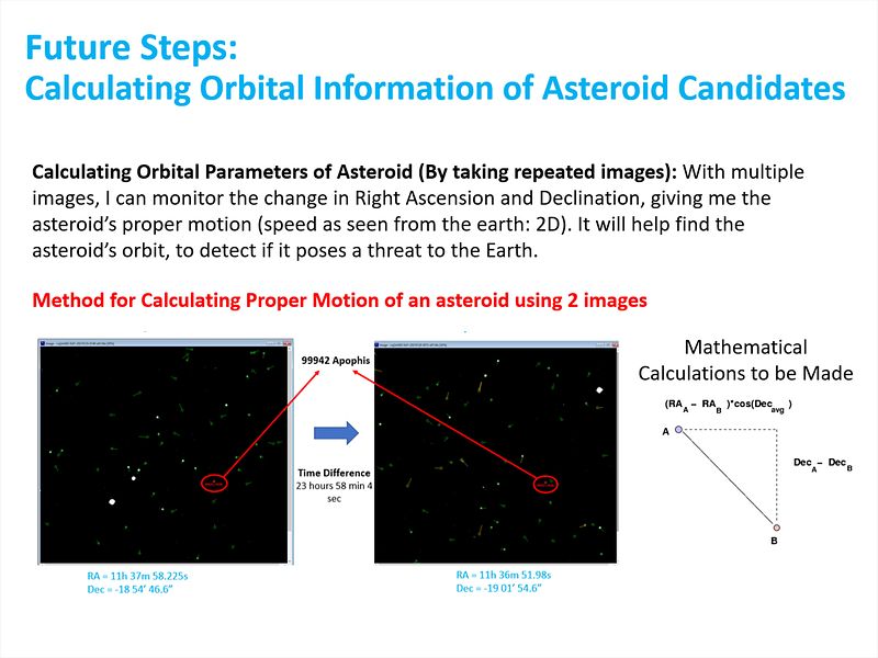My algorithm is open-source; anyone can use it to detect unknown asteroids. It can be expanded to determine the orbital path of asteroids.