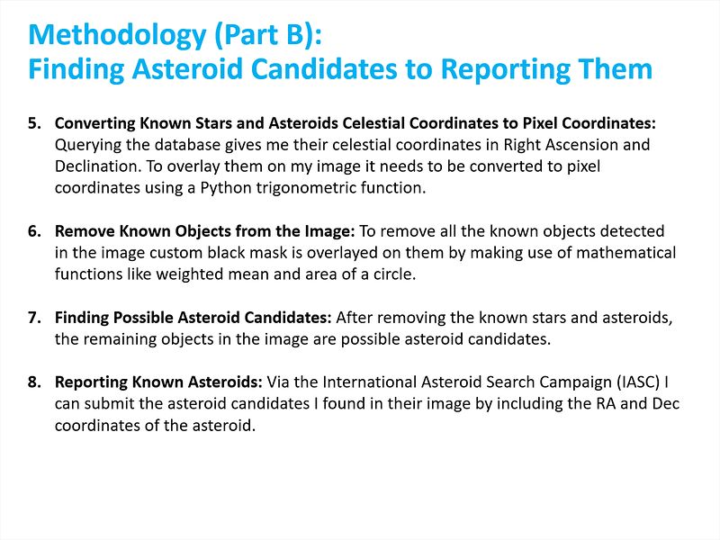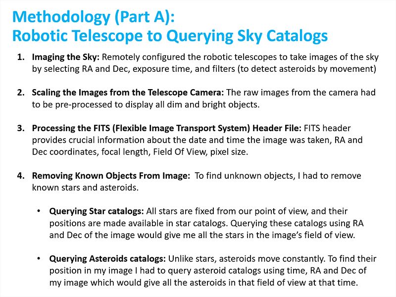 To observe the sky and detect unknown asteroids, I turned to a network of free robotic telescopes to get complete sky coverage. I created an algorithm to remove known objects: stars and asteroids in the image and classify the remaining objects as possible asteroid candidates.