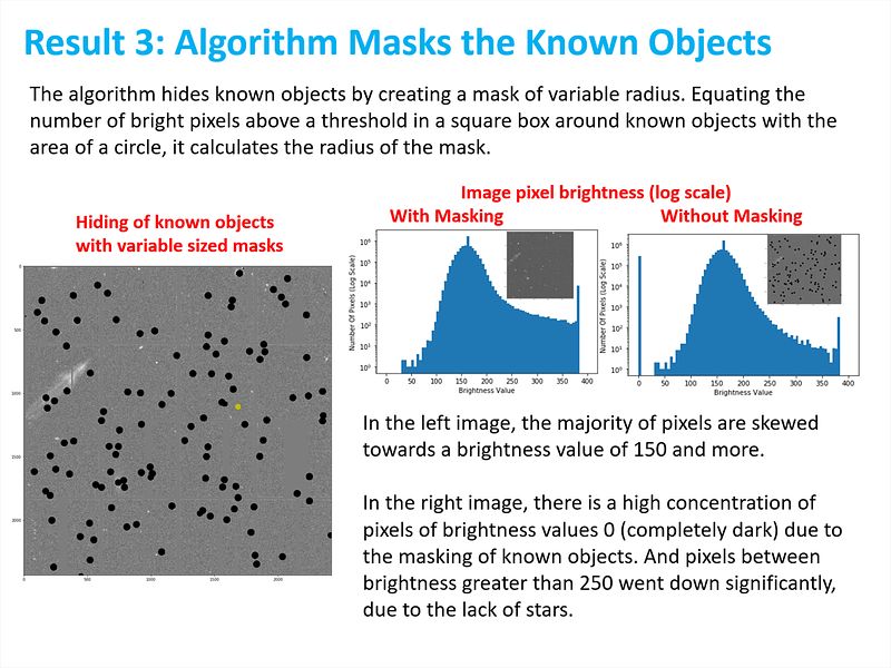 - I eliminated all known objects by writing an algorithm to overlay them with a black mask. The size of the objects determined the mask radius.
