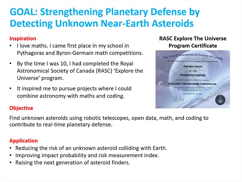 I strengthened planetary defense by using robotic telescopes, open data and my coding and math skills to create an open-source algorithm to detect possible asteroid candidates.
