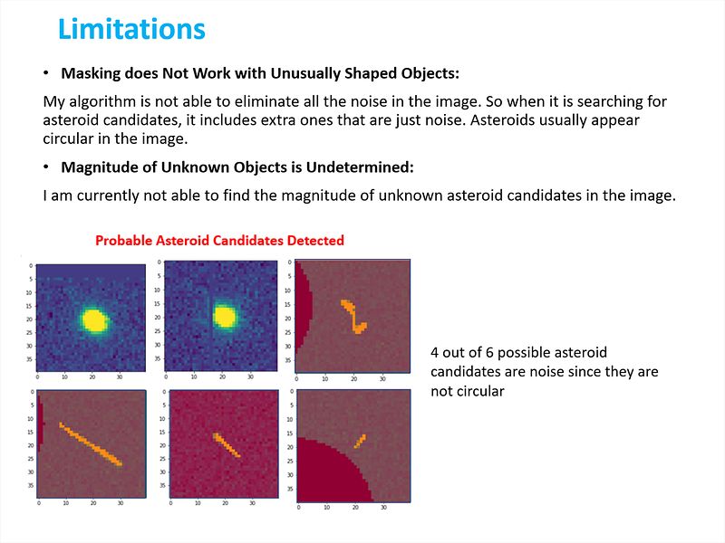 I applied my algorithm to 20 sky images from different robotic telescopes. The algorithm was able to work on all images and identified over 50 possible asteroid candidates. I manually checked each output from the algorithm to remove noise or false positives (incompletely masked stars, irregular shapes, blurred backgrounds). It left me with 30 possible asteroid candidates.