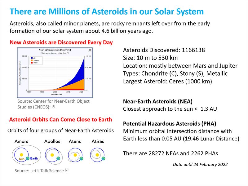 Asteroids are rocky remnants left over from the early formation of our solar system. Over a million asteroids have been identified, with sizes varying from 10 m to 530 km. Most asteroids orbit our Sun between Mars and Jupiter in the main asteroid belt. Sometimes asteroids can migrate from the main asteroid belt. If they come closer than 1.3 Astronomical Units (1 AU = Distance between Earth and the Sun) to the Sun, they are called Near-Earth Asteroids (NEA). If they come even closer: 0.05 AU or 19.46 times the Lunar Distance from Earth, they are called Potentially Hazardous Asteroids (PHA).