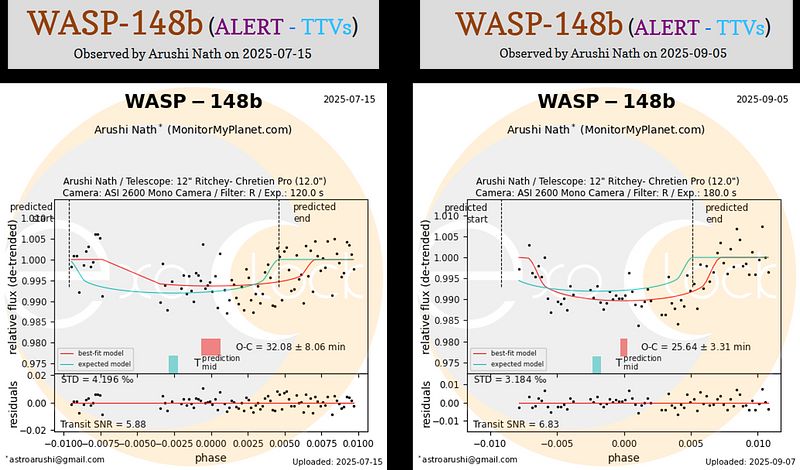 WASP-148b was one of my highest-priority targets, rated ALERT by ExoClock, meaning its ephemeris uncertainty had grown to a level where upcoming transits were at significant risk of being missed. It is also a TTV-flagged planet in a multiplanetary system, where gravitational interactions with its companion WASP-148c are thought to drive the timing deviations. An ALERT rating means the observation window is time-sensitive: the longer it goes unobserved, the wider the uncertainty cone grows and the harder the planet becomes to schedule reliably for Ariel mission.