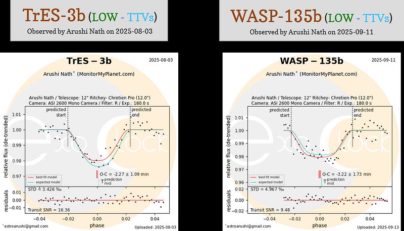 WASP-135b, HAT-P-7b, and TrES-3b are all flagged in the ExoClock catalog as showing transit timing variations (TTV). I observed all of them as these are the transit targets I find most useful, as they provide new data for my NEPTUNE project, which I discuss at the end.