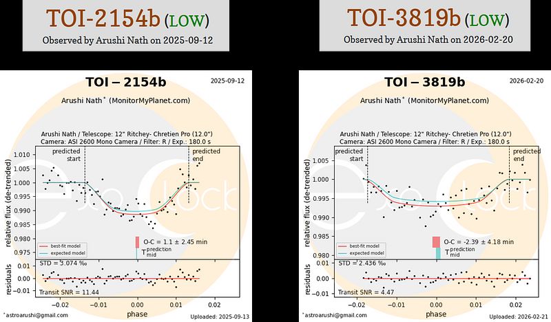 TOI-2154b and TOI-3819b are TESS-discovered planets, the kind that present the most urgent monitoring challenge for ExoClock. TESS monitors each sky sector for only 27 days, compared to Kepler's four-year baseline, so TESS planets start with shorter observational baselines and larger ephemeris uncertainties that grow quickly without follow-up. Both targets are also on the dimmer end of the ExoClock list, requiring careful exposure management to maintain signal-to-noise across the full transit duration.