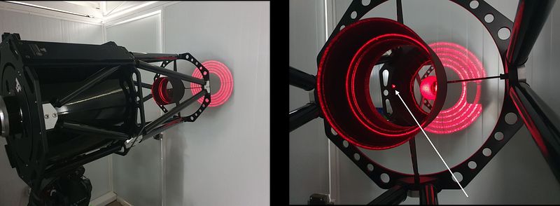 A Ritchey-Chrétien telescope is only as good as the alignment between its two mirrors. Misalignment by a fraction of a millimetre invisible to the eye produces asymmetric star profiles that invalidate photometric measurements. I used the laser-ring method: a collimation laser projects concentric rings onto the primary mirror, and the secondary mirror's tilt screws are adjusted iteratively until all rings are perfectly concentric. The effect is visible in defocused star images: a chaotic, off-centre donut transforms into a clean, symmetric ring.