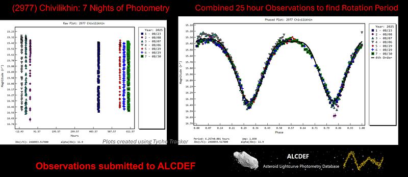 The first extended campaign targeted main-belt asteroid (2977) Chivilikhin: 7 nights, 25 total hours of photometry. By measuring how the asteroid's brightness fluctuates as it rotates — different facets of its irregular surface reflecting varying amounts of sunlight — I derived a rotation period of 6.257 ± 0.001 hours with a light curve amplitude of 1.030 magnitudes, fitting a clean fourth-order Fourier model. The data have been submitted to the Asteroid Lightcurve Database (ALCDEF).
