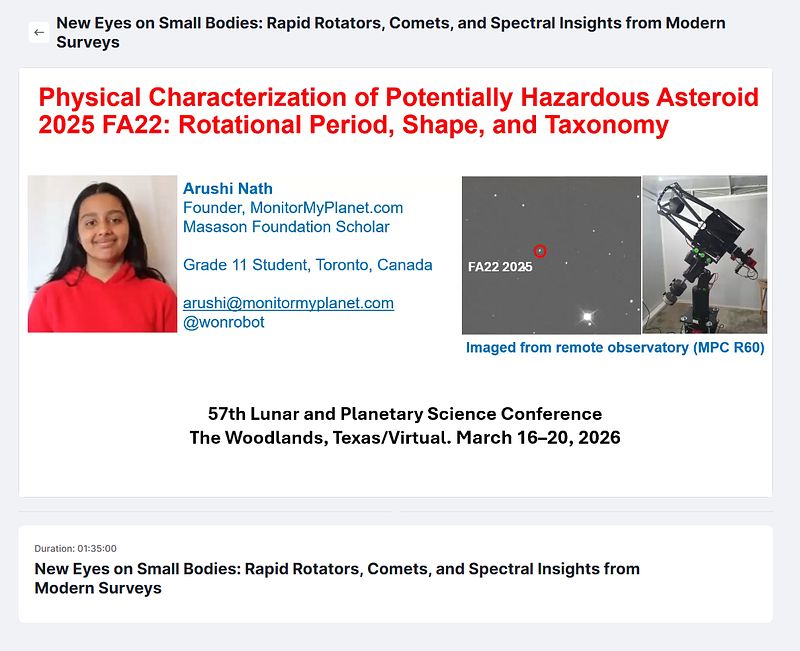 This emerging scenario attracted my attention as I have been pursuing research on near-Earth asteroids for several years. My earlier research developed open-source photometric algorithms to characterize the Didymos binary asteroid system and measure the success of NASA's DART Mission. Using my observations from a network of remote telescopes, I had generated lightcurves of the Didymos binary system before, during, and after the impact to measure the change in mutual orbital period. 2025 FA22 was another opportunity to apply and improve those methods in real time. Interestingly, the International Asteroid Warning Network (IAWN) also started a global campaign to observe this asteroid, and I shared my observations with them. Their report is still forthcoming.